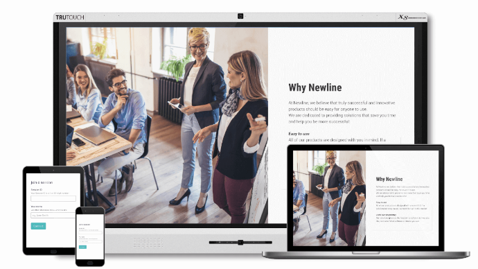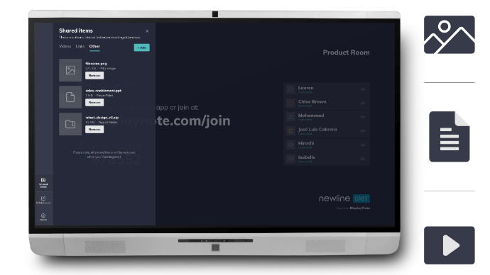 Це найбільш гнучке рішення для бездротового спільного використання екрана, інтегроване в усі інтерактивні дисплеї Newline. За лічені секунди ви можете легко поділитися будь-яким екраном у будь-якій мережі або використовувати безпечний режим для трансляції. Справді безпроблемне рішення, яке дозволяє кільком доповідачам спільно використовувати екран, відео, посилання та файли. Newline Cast дозволяє ділитися своїм екраном з будь-якої точки кімнати. Оживіть свої зустрічі за допомогою рішення номер один у світі для веб-трансляції!