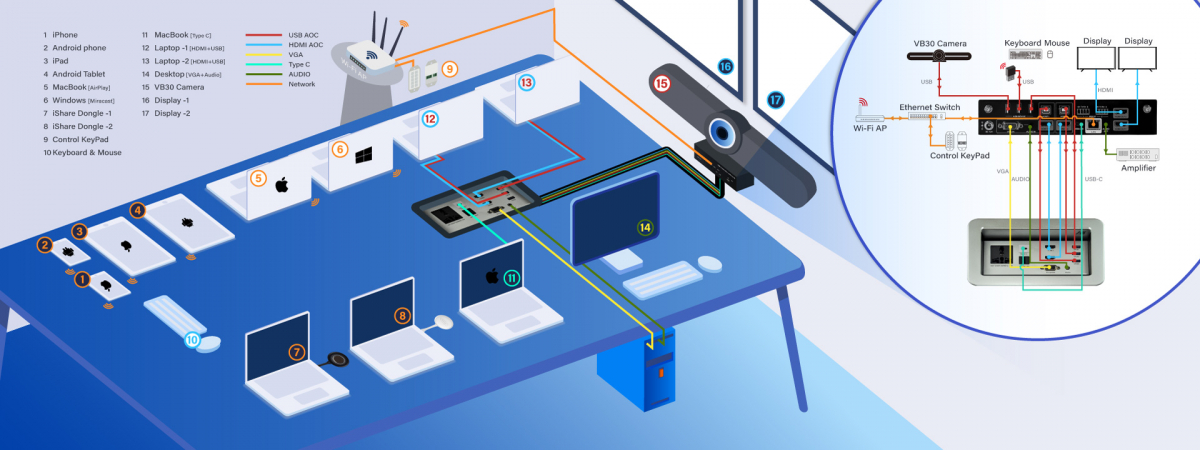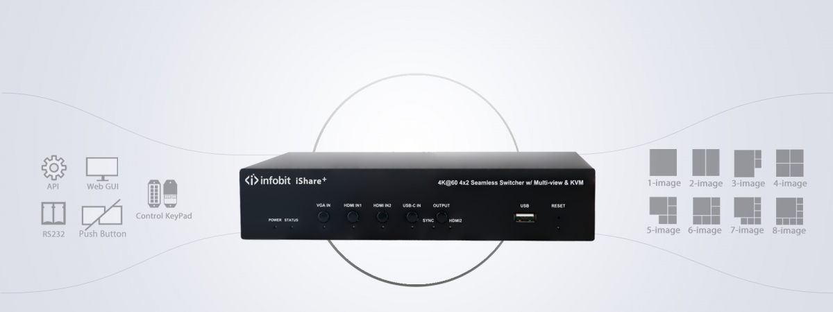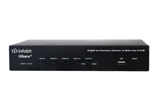 iShare Plus - це високопродуктивний комутатор для презентацій BYOD з можливостями дротових і бездротових презентацій. Він оснащений вбудованим модулем Wi-Fi і підтримує кілька підходів з питань доступу, включаючи Airplay Mirroring, Miracast, фізичні інтерфейси (HDMI, VGA і USB-C) і USB-ключ, за допомогою якого ви можете проектувати вміст екрана вашого комп'ютера (Mac/Windows) або мобільний пристрій (iPhone/iPad/Android) на дисплей в режимі Multiview.