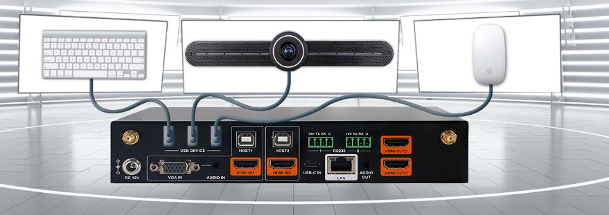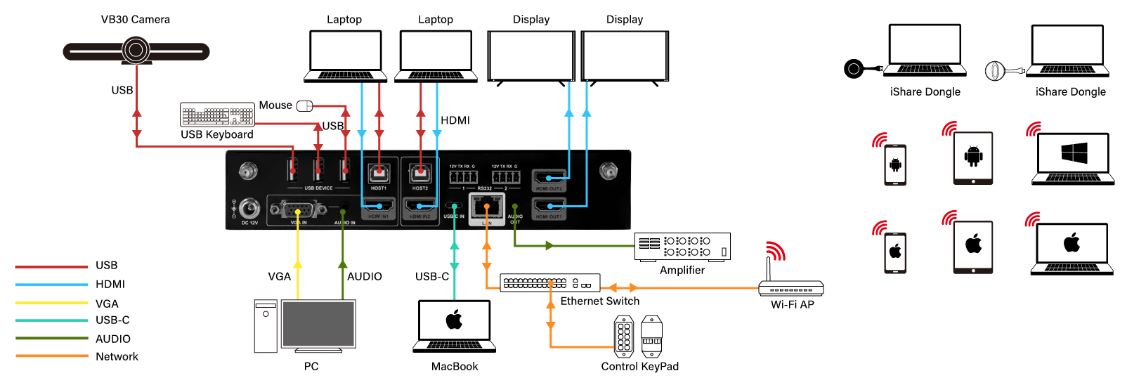 iShare Plus підтримує 4 локальних входу: VGA зі звуком, HDMI 1 з KVM, HDMI 2 з KVM і USB-C.