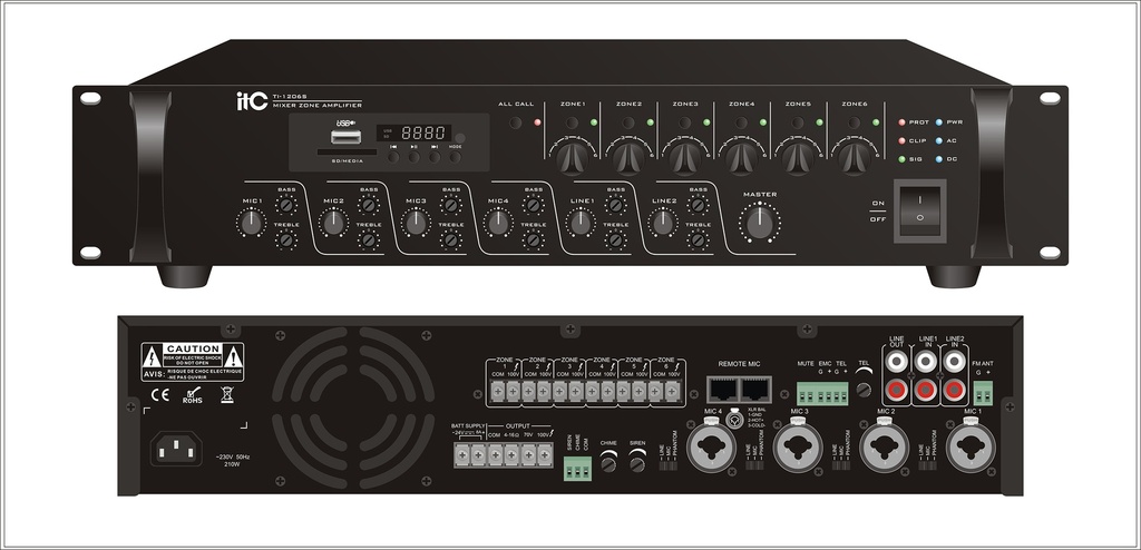 6-ти зональний микширующий підсилювач з USB/SD + FM і Bluetooth призначений для підключення джерел звуку і подальшого їх підсилення для побудови систем озвучування з можливістю вкл / викл та регулювання гучності звукових зон (100В).